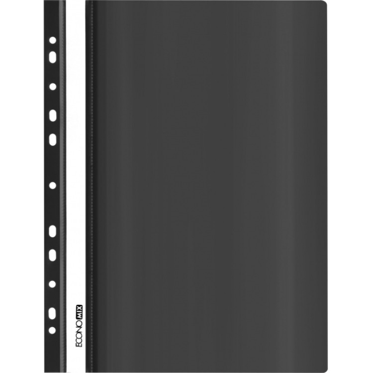 Папка-швидкозшивач А4. Поліпропілен. Чорний колір, глянсовий прозорий верх. Має бічну перфорацію для кріплення в будь-яких видах папок. На лицьовій стороні є кишеня з білою пластиковою смугою для підпису змісту папки. Використовується для зберігання документів в файлах або з отворами під дирокол. Товщина прозорого листа папки 120 мкр., Непрозорого - 160 мкр .