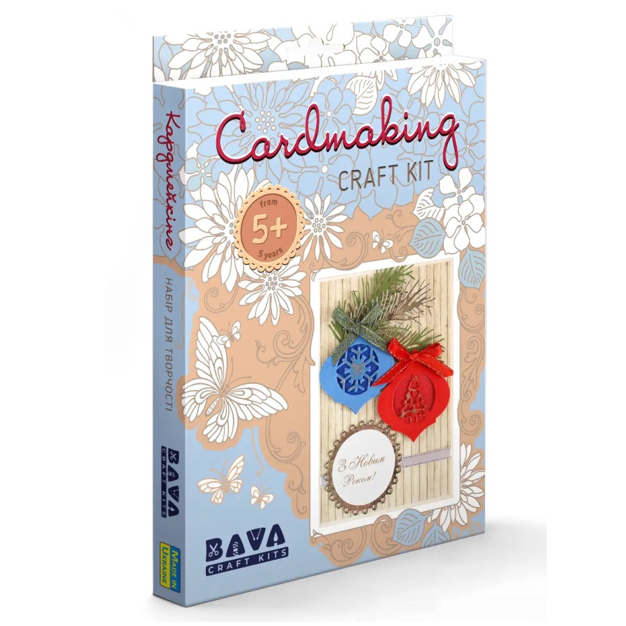У наборі: папір дизайнерський для основи та декорування, всі необхідні елементи для виготовлення листівки, клей PVP.