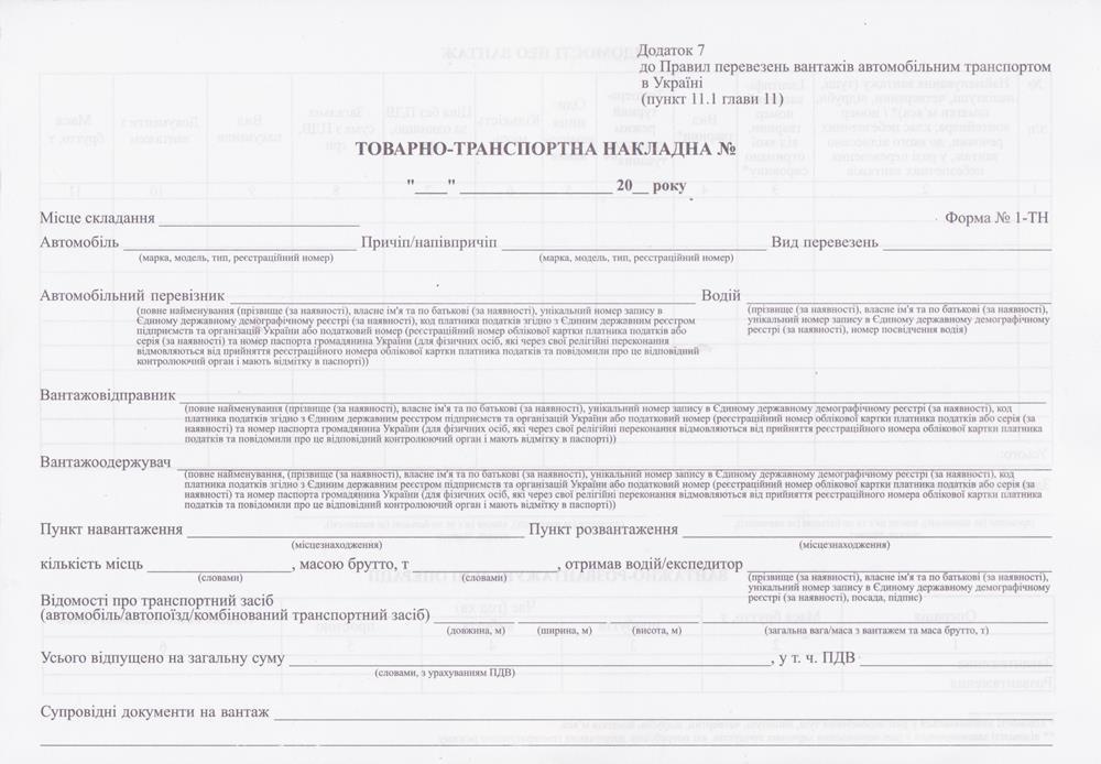Товарно-транспортна накладна ― блок 100 шт. Надруковані на газетному папері щільністю 45г./кв. м. Розмір листа 29,6 х 20,7 см. Двостороння. Формат - А4.